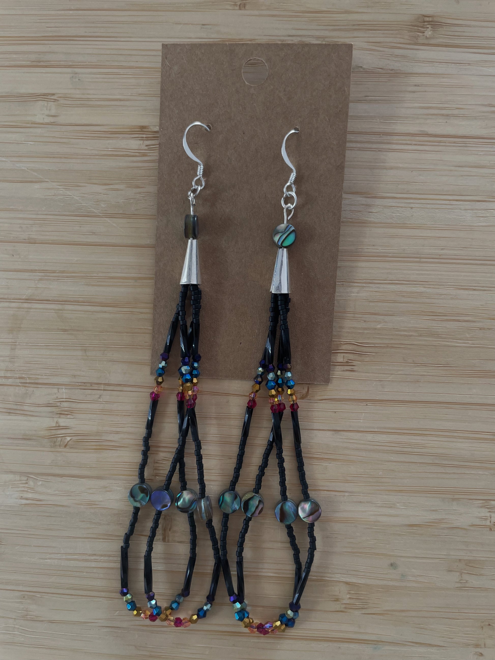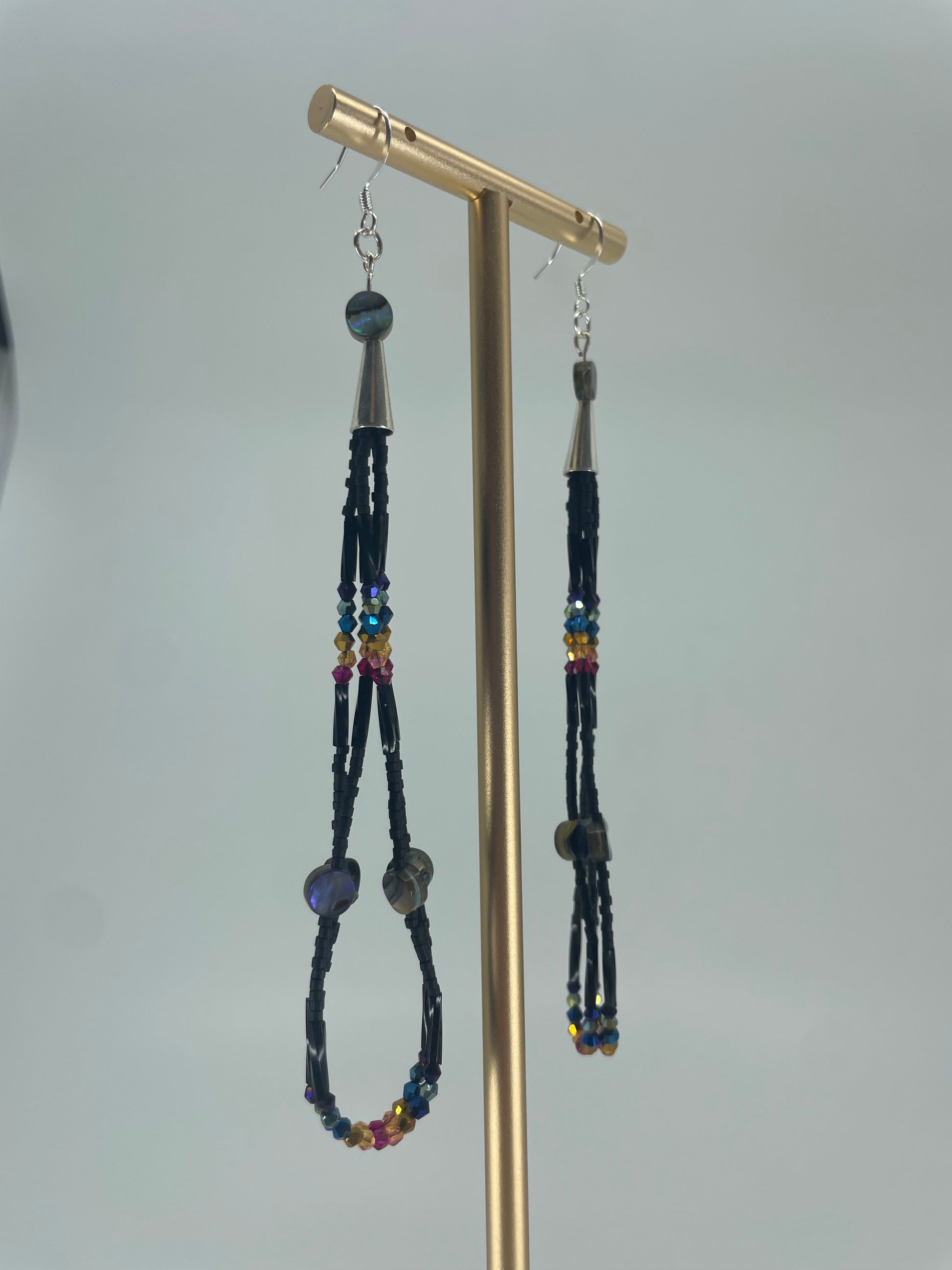Long black seed bead earrings with dark rainbow rondelles and abalone accents.