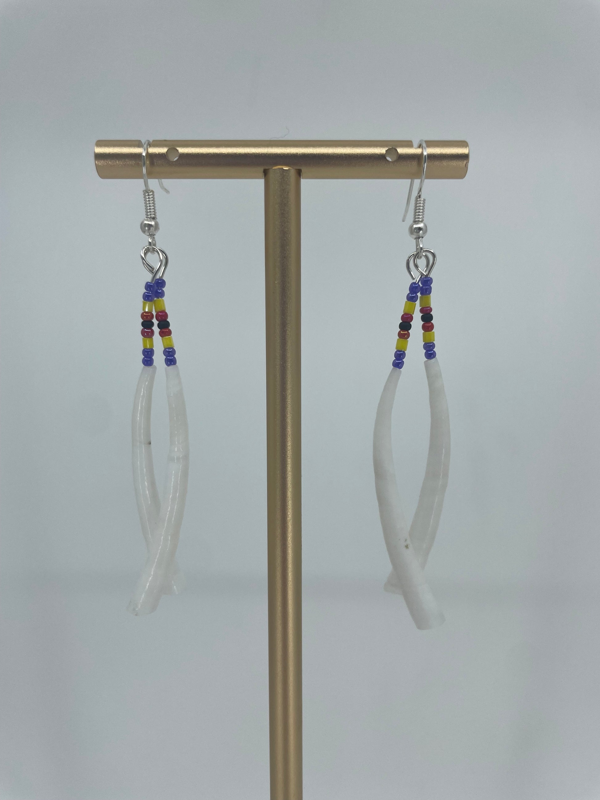 These double dentalium earrings have blue, red, and yellow seed bead accents.